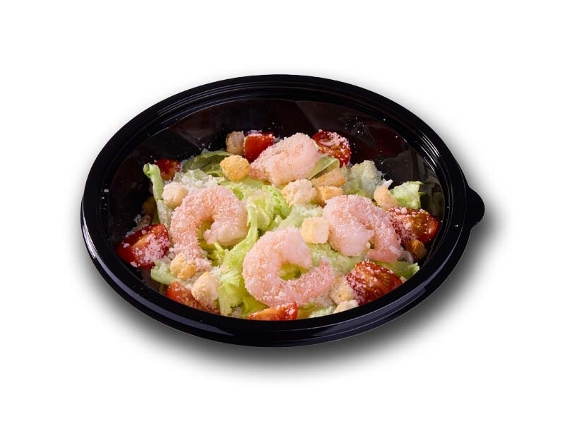 Тигровые вареные креветки, томаты черри, салат айсберг, сухарики, сыр Пармезан, фирменный соус "Цезарь".