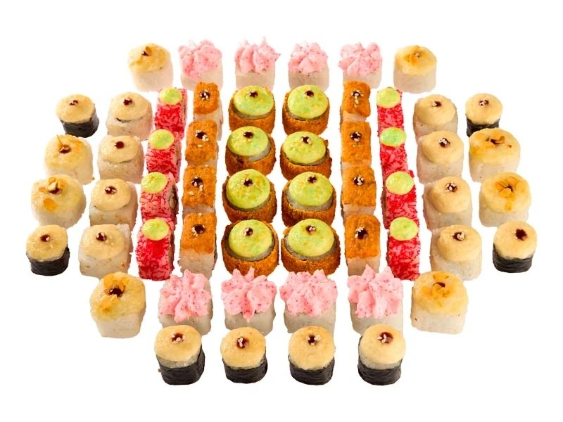 Филадельфия спайси (запеченный ролл с лососем, крем-крабом и сливочным сыром), Туна (запеченный ролл с тунцом, крем-крабом, сливочным сыром, икрой масаго под чесночным соусом), Царский кальмар (темпурный ролл с кальмаром, запеченный под чесночным соусом), Лава с креветкой (ролл с креветкой, сливочным сыром и огурцом под соусом Лава), Запеченный с окунем (ролл с рыбными палочками, сливочным сыром и овощами, запеченный под сырным соусом), Курица и ананас (ролл с курицей, сливочным сыром и ананасом, запеченный под соусом Тая, оформлен лепестками арахиса), Крабик чиз (ролл с крем-крабом, запеченный под сырным соусом). 56 шт.